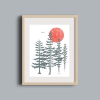 Dreaming of the forests...Evergreen is our hand silkscreen printed art print. Hand pulled screenprint of evergreen trees and a red sun.